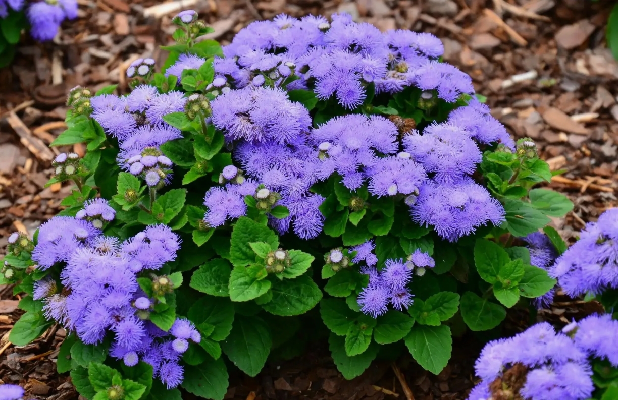 Пушистые цветы агератума напоминают яркие помпончики и продолжают украшать сад до поздней осени. Они привносят в палитру сада оттенки голубого, фиолетового, белого и розового, наполняя его радостью и красотой.