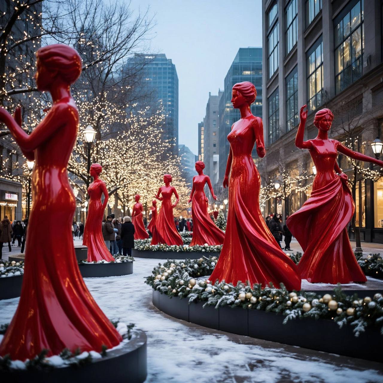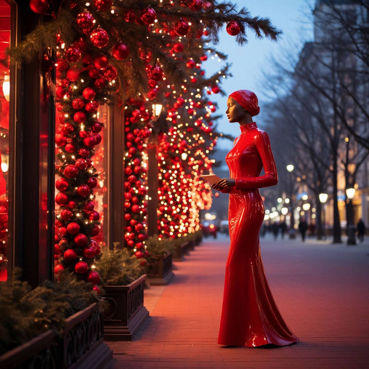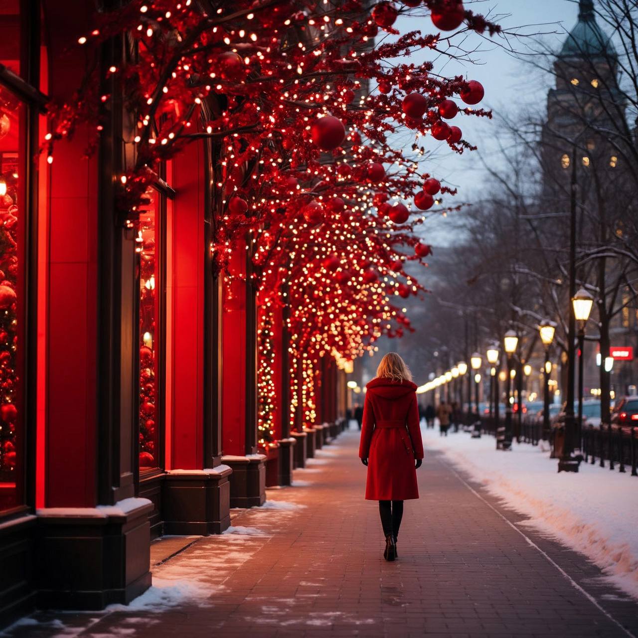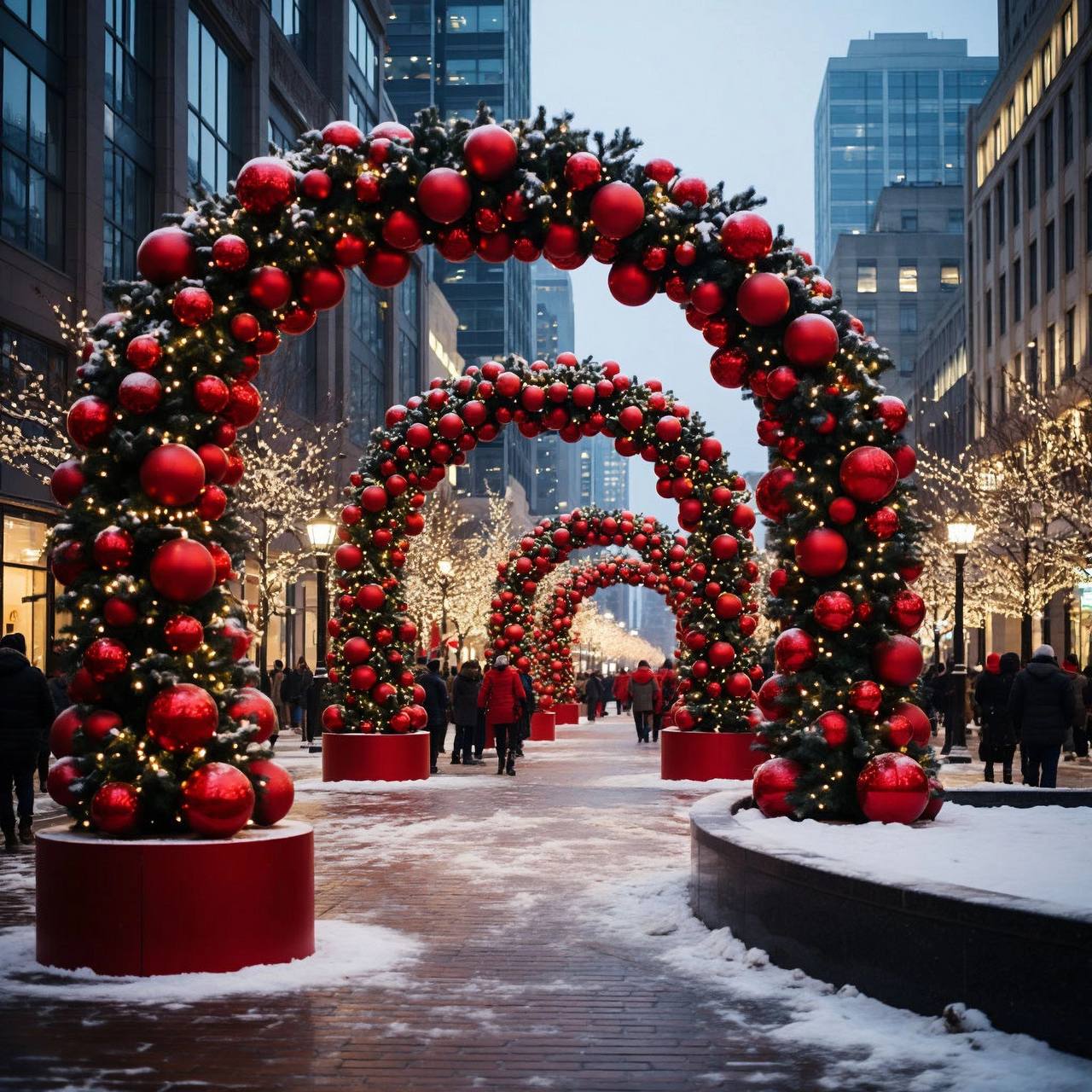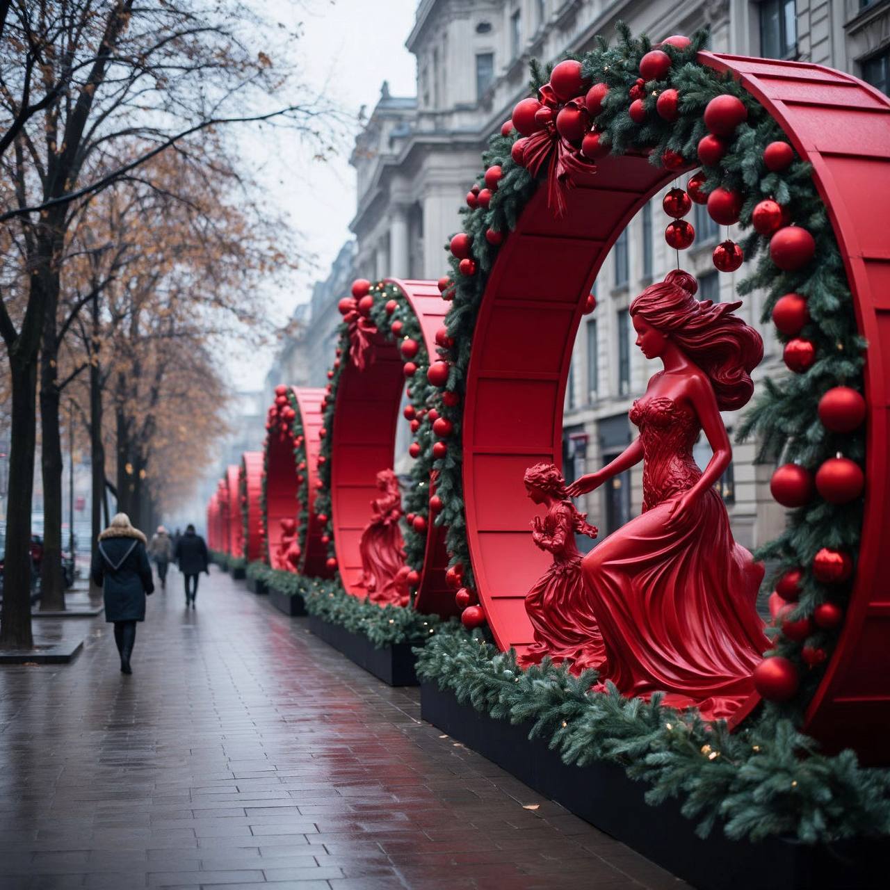 Мы также работаем с общей городской эстетикой. Здания с ярким фасадным освещением создают «визуальный коридор», который мягко ограничивает пространство, делая его более интимным и камерным. А такие элементы, как купол исторического здания, видимый вдали, служат важной точкой ориентира, связывая современный декор с архитектурным наследием места. В итоге получается образец гармоничного слияния дизайна и ландшафтного проектирования: здесь каждая деталь — от цвета пальто прохожего до расположения фонарей — работает на создание праздничного, но при этом функционального городского пространства, которое не только радует глаз, но и подчеркивает сезонную специфику, не нарушая повседневной жизни. Это не просто украшение — это набор инструментов для управления восприятием среды, где красота и практичность идут рука об руку.