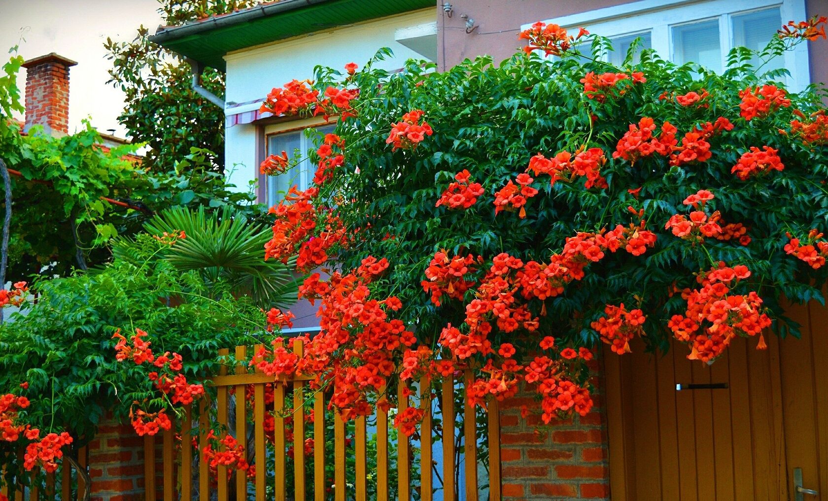 Кампсис прекрасно развивается на крепких опорах, растет он удивительно быстро, с каждым годом становясь все крепче и сильнее.