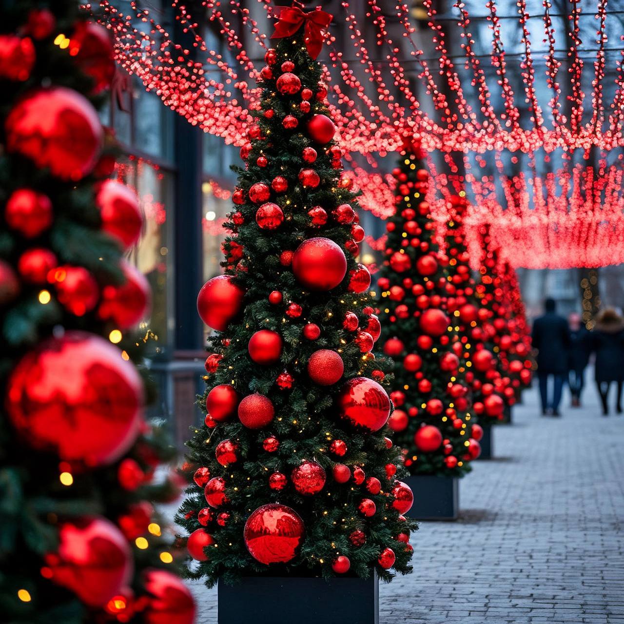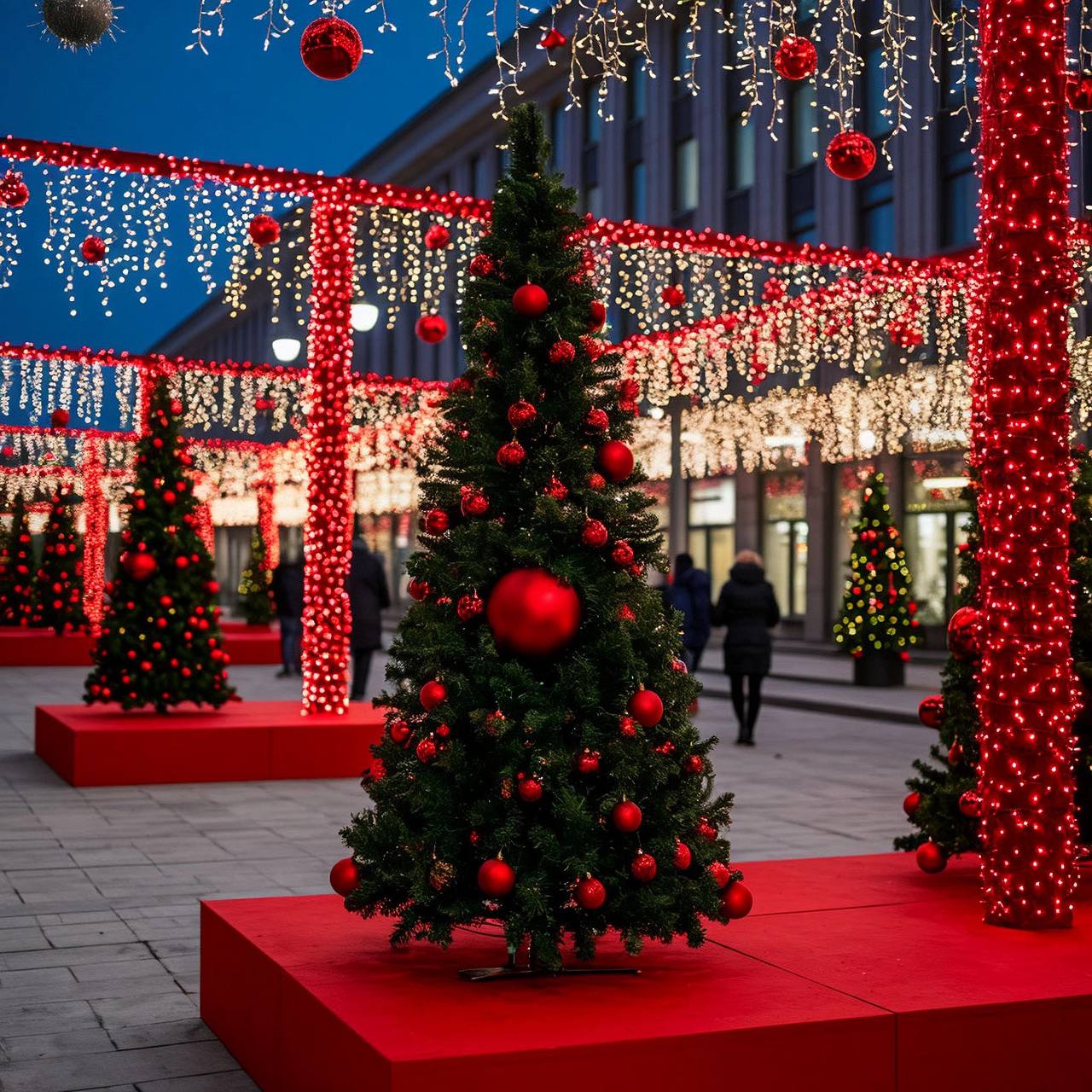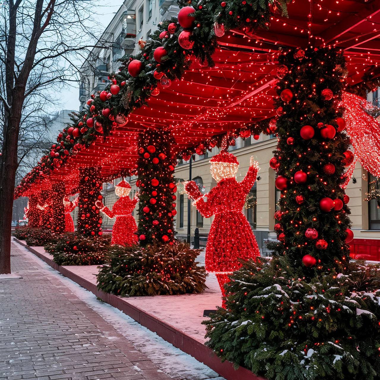 Теперь давайте поговорим о самом выразительном инструменте — цвете. В нашей работе мы относимся к цвету как к живому существу, которое может говорить, утешать и вдохновлять. Доминирующий красный выступает как ключевой акцент в наших праздничных ансамблях. Представьте себе световые гирлянды, мерцающие словно рубины, объемные шары, напоминающие спелые гранаты, и силуэты фигур людей, выполненные в насыщенном красном. Этот цвет не кричит, он поет мощную, красивую песню о радости, энергии и тех самых традиционных новогодних ассоциациях, которые живут в сердце каждого из нас. Но сила красного была бы неполной без достойного окружения. Его контраст с природными оттенками является основой визуальной гармонии. Белый снег, лежащий на ветках и тротуаре словно бархат, темно-зеленые еловые ветки, хранящие память о лете, и серые фасады исторических зданий, выступающие в роли благородного фона, — все они подчеркивают яркость декора, создавая четкую и ясную визуальную иерархию. В итоге рождается удивительный эмоциональный эффект. Теплый свет и динамичные силуэты, например, фигуры «танцующих» людей, придают пространству ту самую жизненность, которая превращает холодную зимнюю улицу в уютное, приглашающее место, где хочется задержаться, подышать морозным воздухом и почувствовать биение праздничного пульса города.
