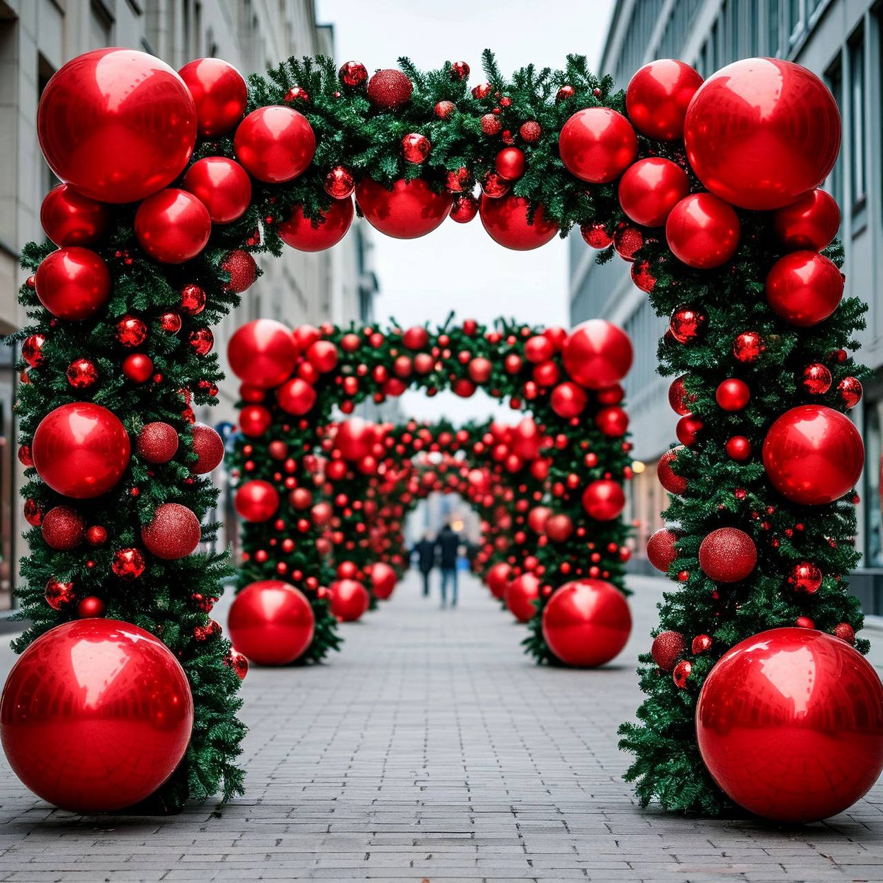 Создание новогоднего декора — это во многом работа с пространством, его ритмом и перспективой. Мы не накладываем украшения на готовый ландшафт, мы выстраиваем с ним диалог. Одним из наших любимых приемов является работа с перспективой и ритмом. Представьте себе арки, повторяющиеся вглубь кадра, они создают ту самую линейную перспективу, которая мягко ведет взгляд зрителя и формирует ощущение движения, путешествия в сказку. Ритмичное чередование колонн, украшенных шарами, и световых фигур добавляет композиции динамики, не позволяя ей стать статичной и скучной. Не менее важен и вертикально-горизонтальный баланс. Высокие арки и колонны, устремленные вверх, являются мощной вертикалью, которая контрастирует с горизонтальной линией тротуара и низкими кустарниками у основания. Этот контраст обеспечивает композиции устойчивость и законченность, делая ее приятной глазу на подсознательном уровне. И, конечно, мы всегда помним о масштабе и пропорциях. Наша инсталляция должна быть не инородным телом, а органичной частью города. Поэтому ее высота позволяет людям свободно перемещаться под сводами, а ширина прохода никоим образом не нарушает функциональность тротуара. Праздник должен быть удобным, ведь настоящая красота неотделима от комфорта.
