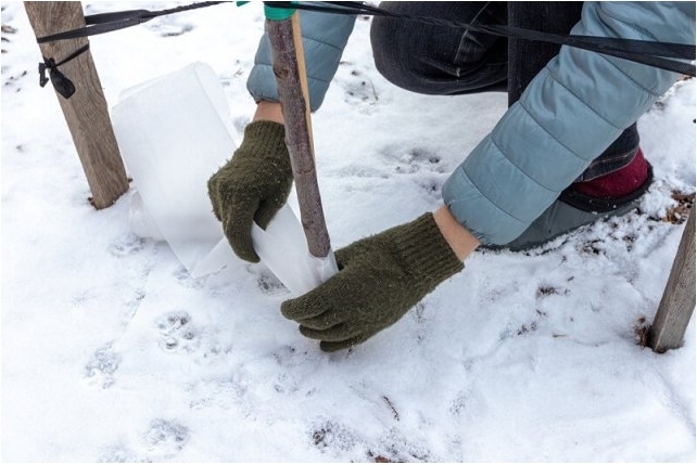 Для защиты деревьев можно использовать различные материалы, такие как рубероид, подложка под ламинат, утеплитель или теплоизоляция для труб. При их применении важно оставлять зазор между стволом и укрывным материалом для обеспечения циркуляции воздуха. Эти материалы фиксируются с помощью проволоки, шпагата или скотча. По сути, вы создаёте не сплошное покрытие ствола, а своеобразную «стенку» от ветра и грызунов. Важно, чтобы эта «стенка» не касалась древесины, чтобы предотвратить её выпревание.